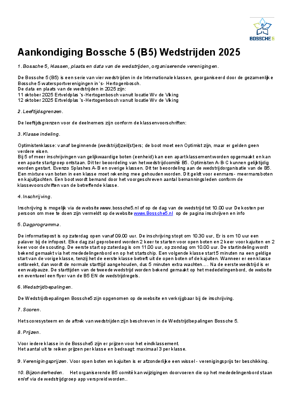 Waarvoor: 50 jaar Bossche5Wanneer: 11 en 12 oktober 2025Waar: Ertveldplas in 's-Hertogenbosch; Speciaal: Zwaardboten en kielboten varen apart!